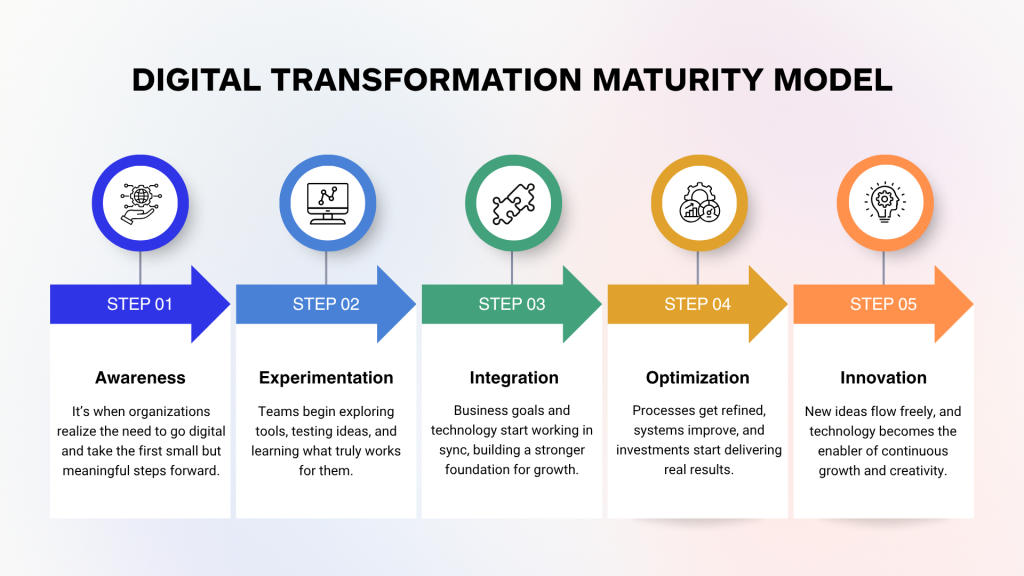 The final stage represents maturity, where digital thinking is embedded in the company’s DNA. Technology no longer feels like a separate function; it’s part of everyday decision-making.